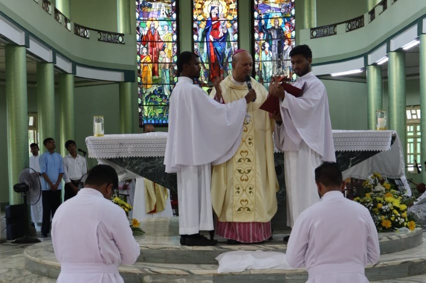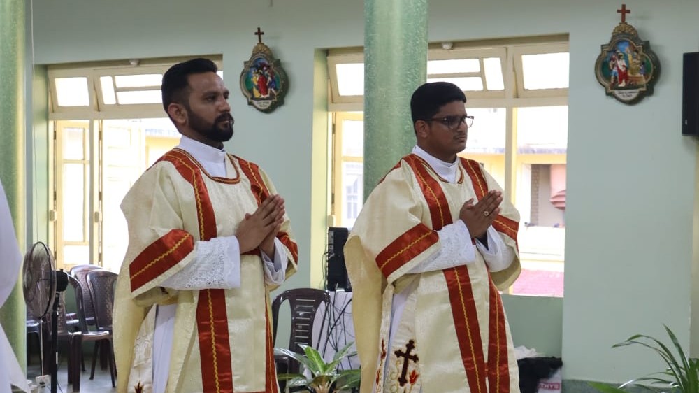 Pilar, Goa, October 5, 2025: Bishop Simião Fernandes, Auxiliary Bishop of the Archdiocese of Goa and Daman, ordained Scholastic Rajat Singh SFX and Scholastic Mantheosha Fernandes SFX of the Society of Pilar as deacons during a solemn Eucharistic celebration at the Seminary Chapel of All India Mission Seminary, Pilar.