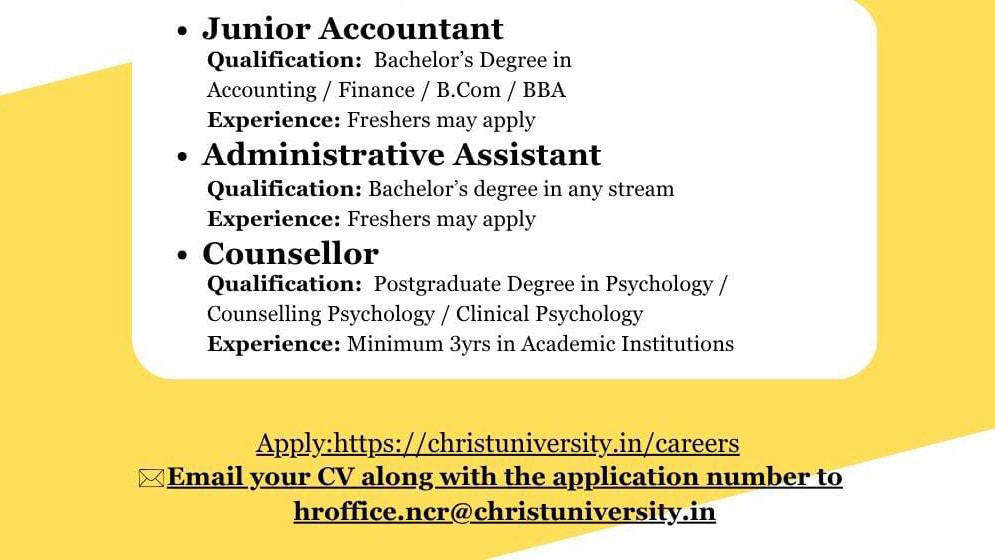 Interested candidates can apply through the university’s official career portal at https://christuniversity.in/careers or send their CVs and application numbers to hroffice.ncr@christuniversity.in.