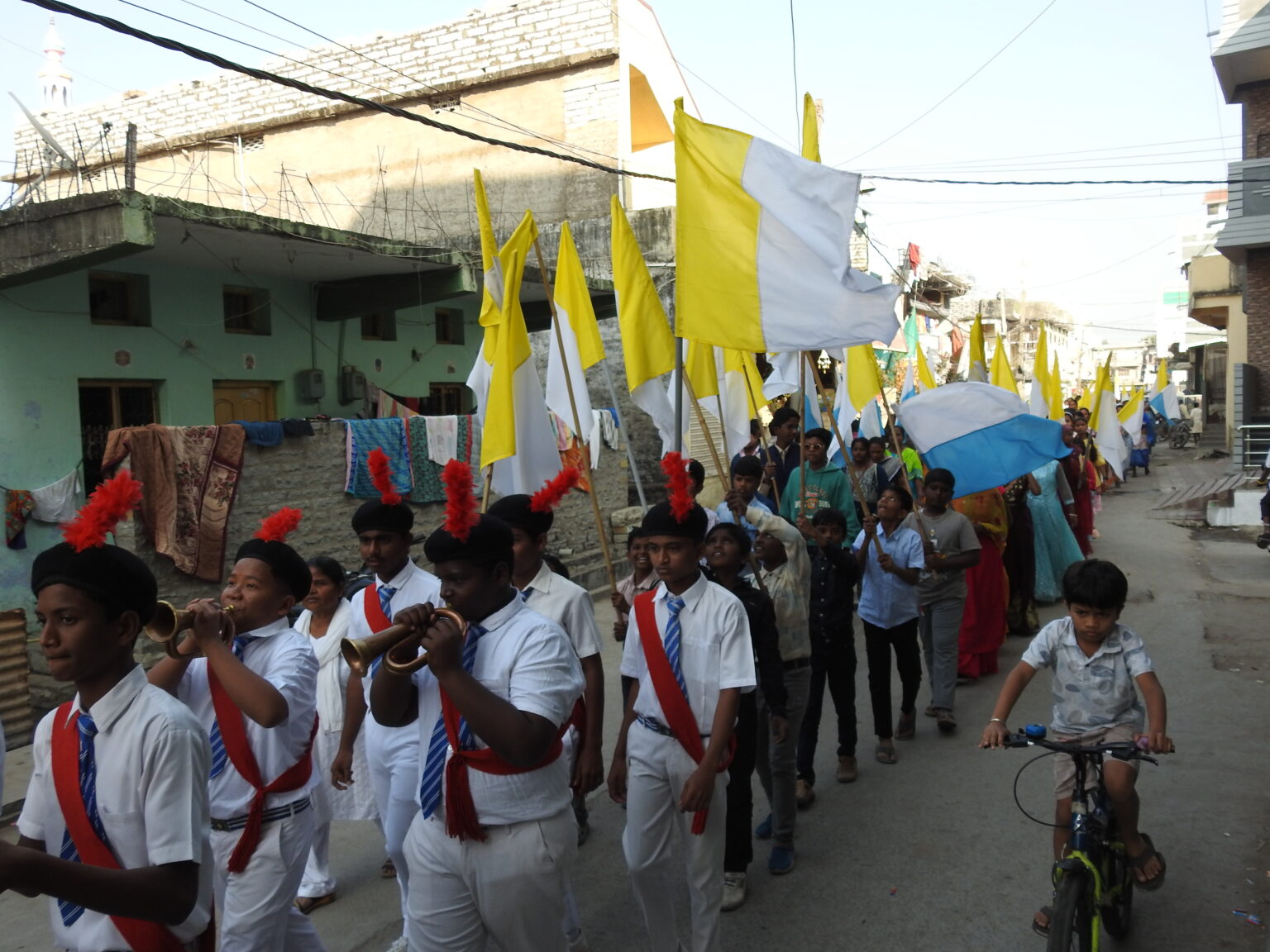 The procession commenced at the Methodist Church, Wadi, with the participation of a large number of the faithful. Fr. Joseph Praveen, Dean of Gulbarga Deanery, proclaimed the Gospel on the Magnificat, also known as the Song of Hope. Led by Fr. Vincent Pereira, Parish Priest of Queen of Heaven Church, Chittapur, the procession proceeded towards St. Ambrose High School, Wadi, as participants carried the Cross, flags and a tableau of the Holy Family, accompanied by hymns and carols.