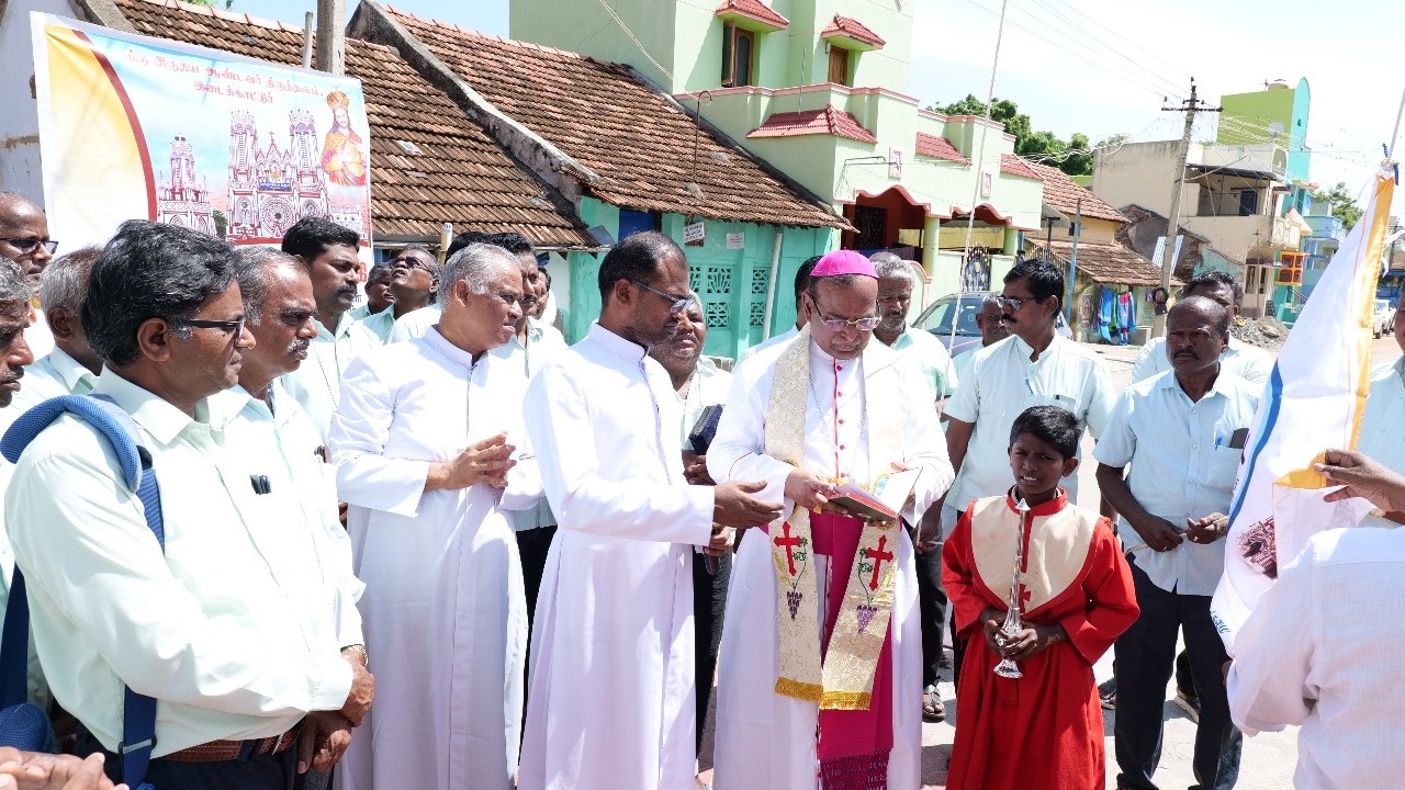 Bishop Lourdu Anandam, of Sivagangai, presided over the solemn Eucharistic celebration. During the ceremony, he hoisted the Jubilee Year flag and blessed saplings that symbolized new life, hope, and the diocese’s dedication to nurturing both faith and creation. He was joined by Fr Arul Joseph, Vicar General, Fr. Maria Dellus, Chancellor, Fr. Sebastin, Diocesan Commissions Coordinator, and several priests, who accompanied the faithful in prayer and thanksgiving.